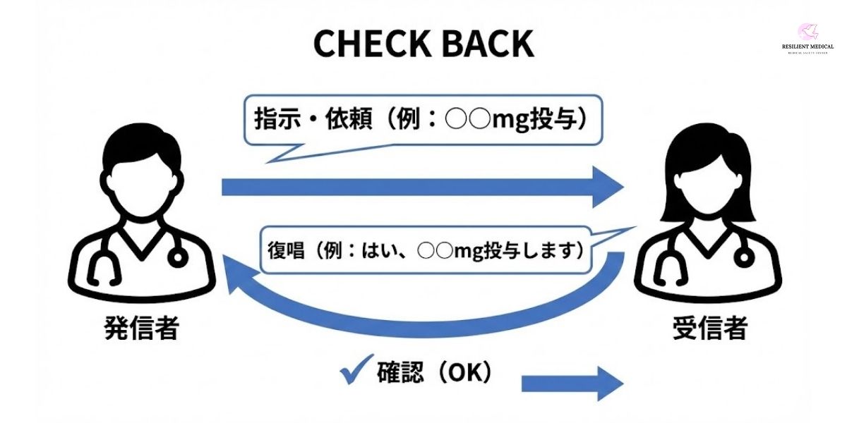 「CHECK BACK(チェックバック)」とは復唱という意味で、指示や依頼したこと(されたこと)を繰り返し反復して伝え合うことです。例えば以下の図のようなやり取りになります。