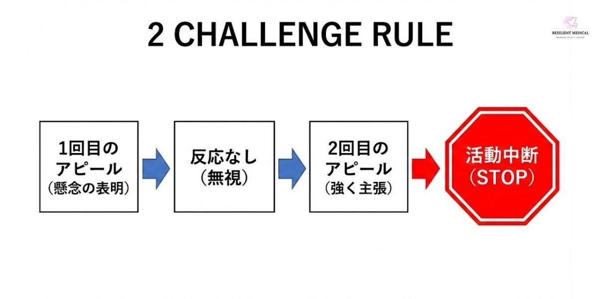 「2 CHALLENGE RULE(2チャレンジルール)」とは、安全に関する重要な義務の違反や誤りなどを発見したり感じた場合に、ひとまず活動を中断させるためにアピールを繰り返すことです。