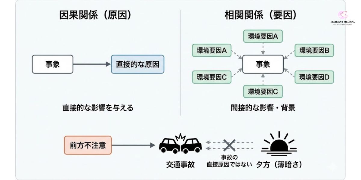 交通事故を例にすると、事故は夕方に多く発生するといわれてます。この場合、夕方の薄暗さが事故の”要因”にはなりえます。しかし一方で、夕方に必ず事故が起きるわけではありません。夕方の環境が事故に何かしらの影響がある相関関係は認められるものの、事故の原因が「夕方だから」という結論にはなりません。