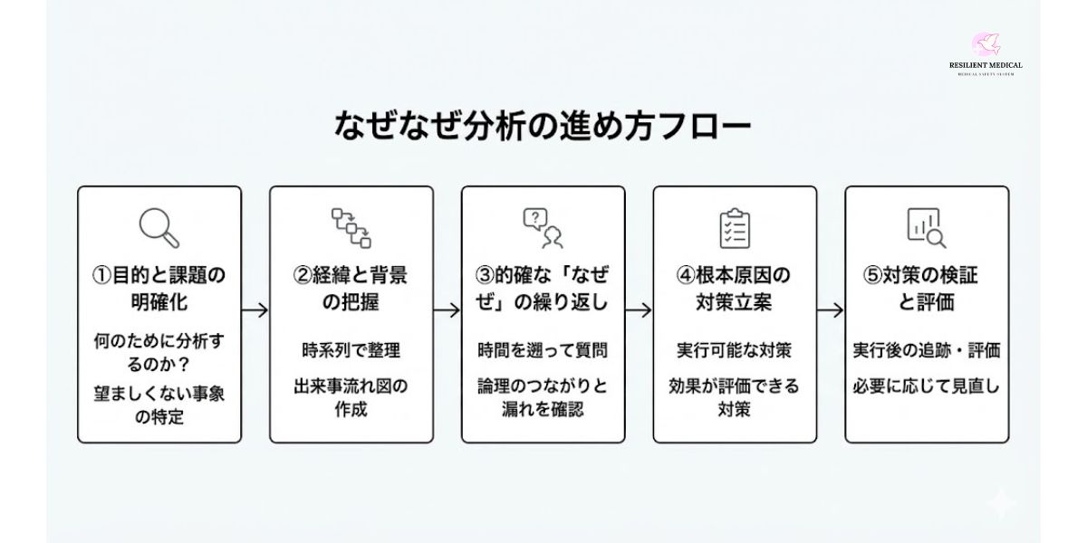 それでは次に「なぜなぜ分析」の具体的な手順と進め方を解説します。