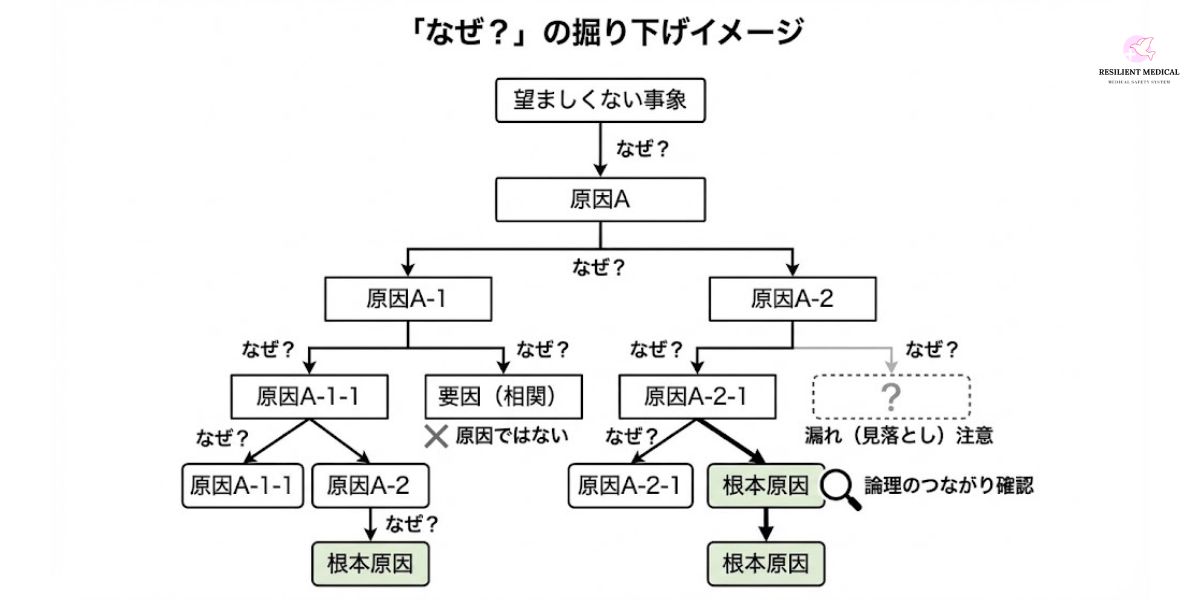 「なぜ」という問いを繰り返していく上で注意したいのは、「つながり」と「漏れ」です。