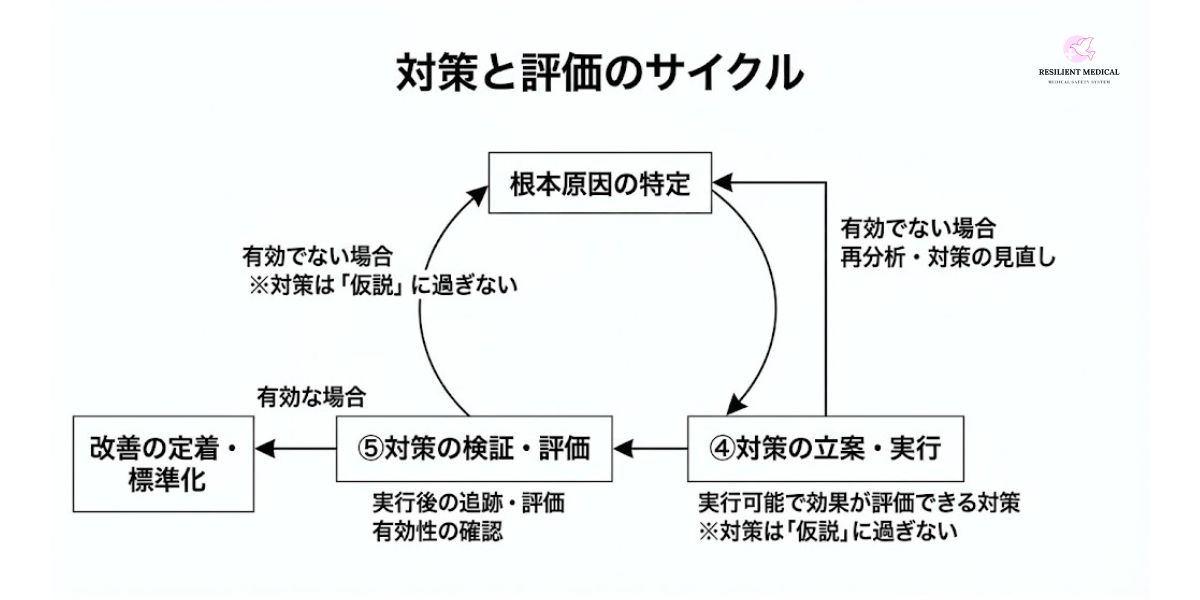 そのため、根本原因の対策案を立案する際には、実行が可能で評価しやすいものでなければならないのです。