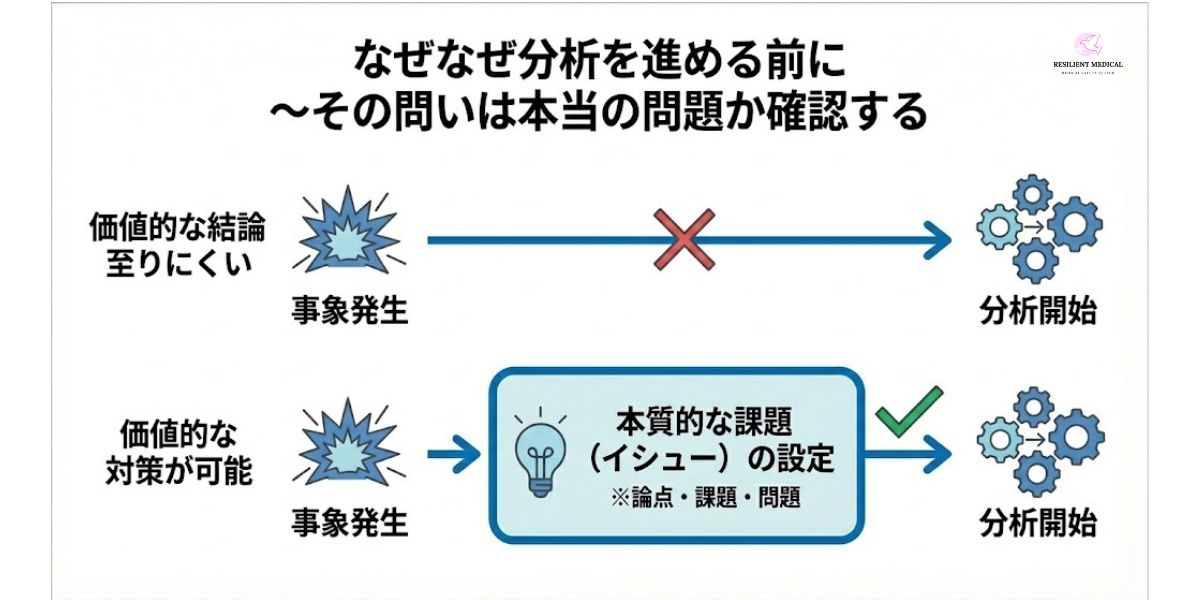 1つの有害事象が発生した場合、わりと多くの人々が「事象そのもの」を課題の論点として分析を開始します。発生した出来事はハッキリしており、あえて分析する課題を検討することに時間を割く必要はないと考えるのです。