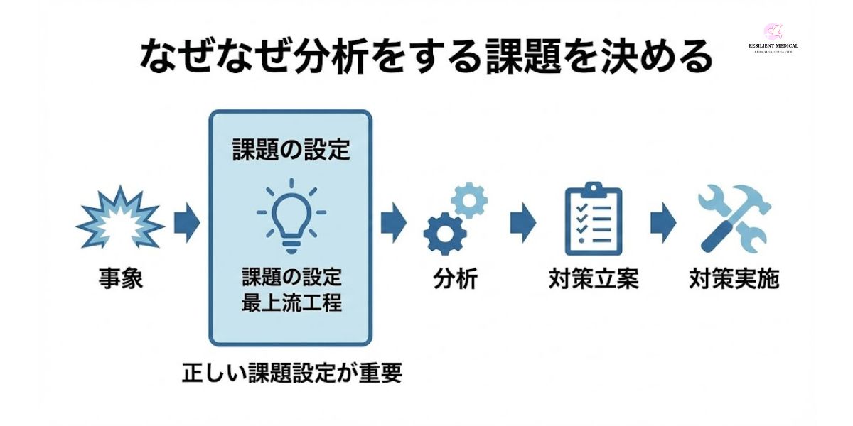 なぜなぜ分析は、インシデントやアクシデントに対して講ずる手段です。そのため、分析には当然ながら「課題」が必要となります。以下の図は、本質的な課題を決定するための流れを表したものになります。