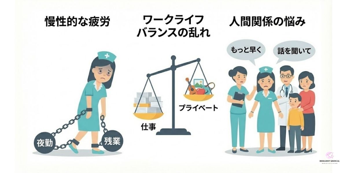 夜勤が多い勤務シフトや業務の多忙さがある場合、特に顕著な疲労となってきます。それによって、体力的なものだけではなく精神的にも大きな負担を感じることが増加していきます。