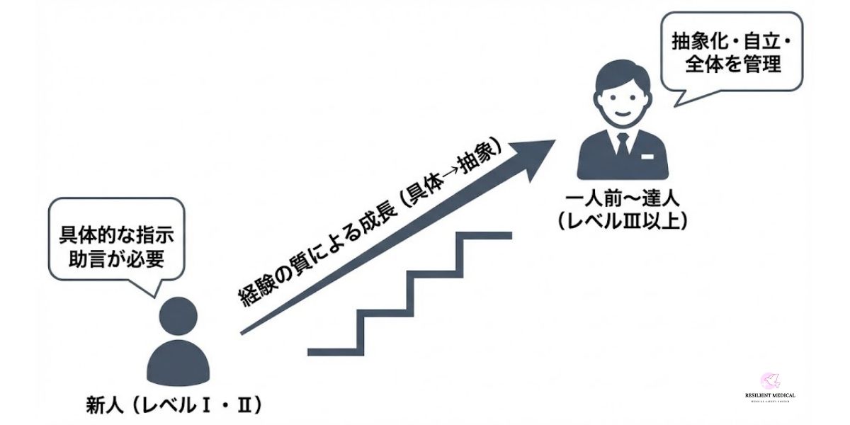一方で、看護師が成長していく過程においては、少しずつ抽象化して物事を考え行動できるようになっていきます。いわゆる「自立」です。