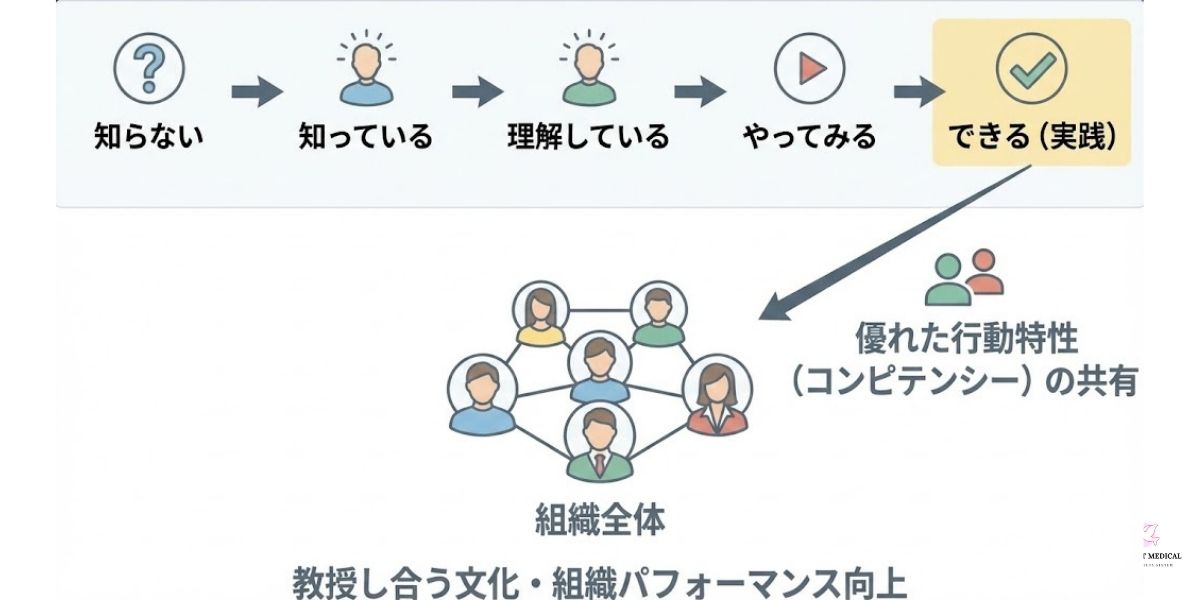 ここで重要なことは、「知らない」「知っている」「理解している」という段階を超えて、いかに実践していくかにあります。そしてその過程を通じて、成果につながる行動特性、つまりコンピテンシーを共有することによって結実していくのです。