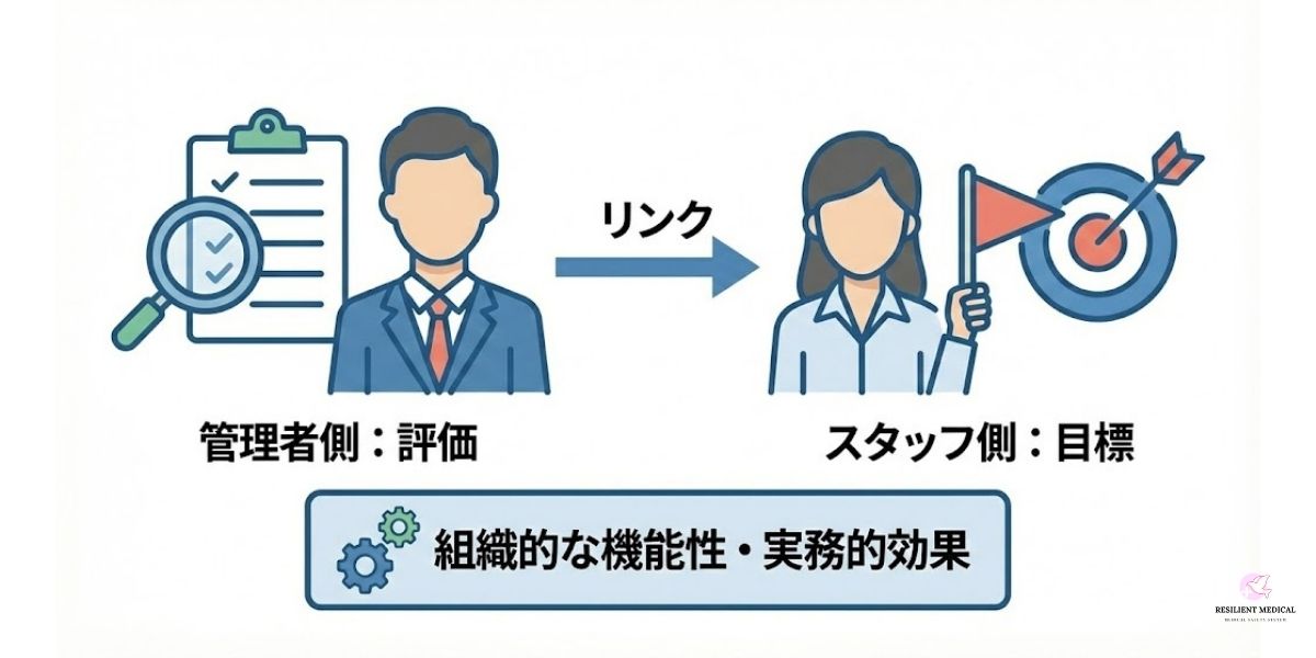 管理者側にとっての「評価」は、スタッフにとっては「目標」という概念になります。それによって評価と目標がリンクし、組織的な機能性をもつに至るのです。