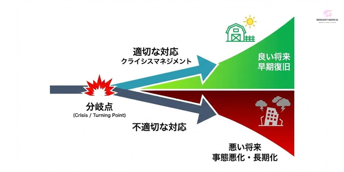 「クライシス(crisis)」の語源は「将来を左右する分岐点」であり、クライシスマネジメントとはまさに、危機的な事態が発生してからの対応によって将来を左右することでもあります