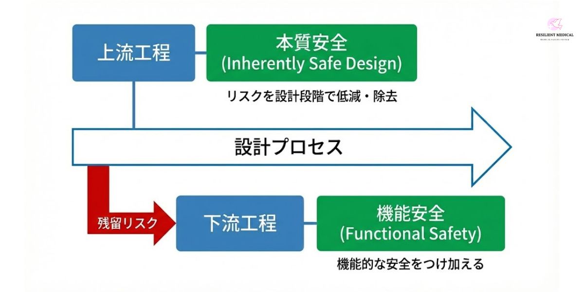 そもそも本質安全が可能であれば、機能安全を考慮する可能性が無くなる場合もあるため、本質安全は機能安全よりも工程としては上流工程になるわけです。