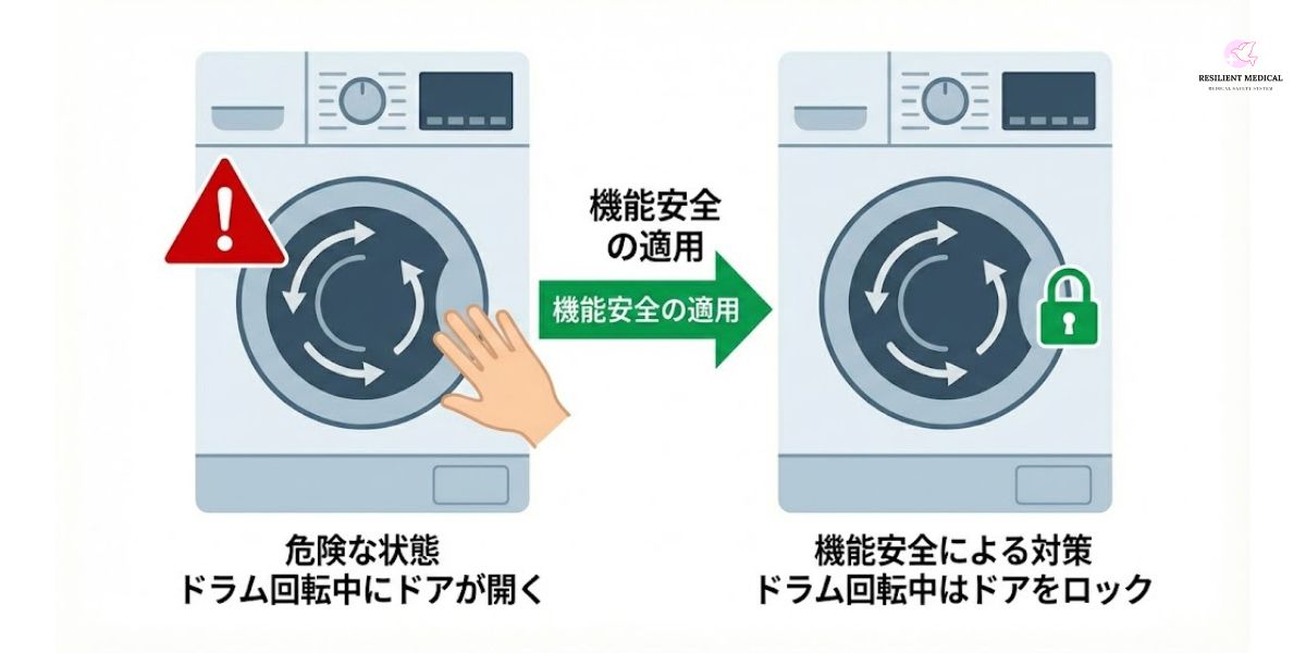 しかし、技術的あるいは経済的な理由などによって、ドラムが回転しない洗濯機を製造することが困難であれば、ドラムが回転している間は洗濯機の開閉ができないようにロックすることで安全を確保することができます。これが機能的な対策によって安全を確保する機能安全です。
