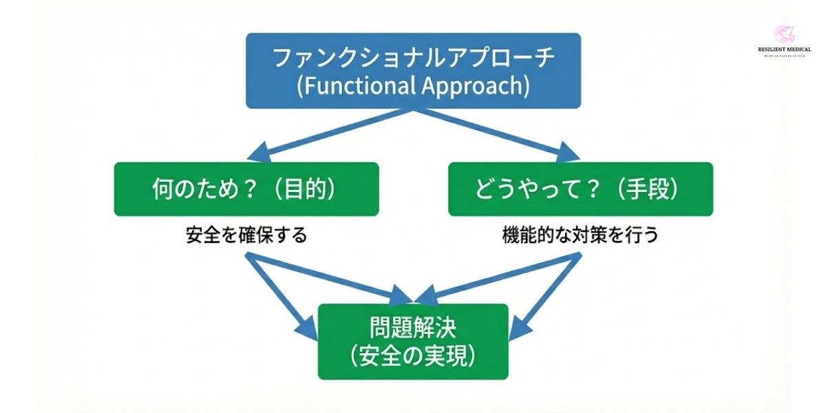 ファンクショナルアプローチは、「何のため」と「どうやって」という2つの視点から問題解決を実現する手法です。つまり、その機能は何の安全のために行うのかを検討するためのツールです。