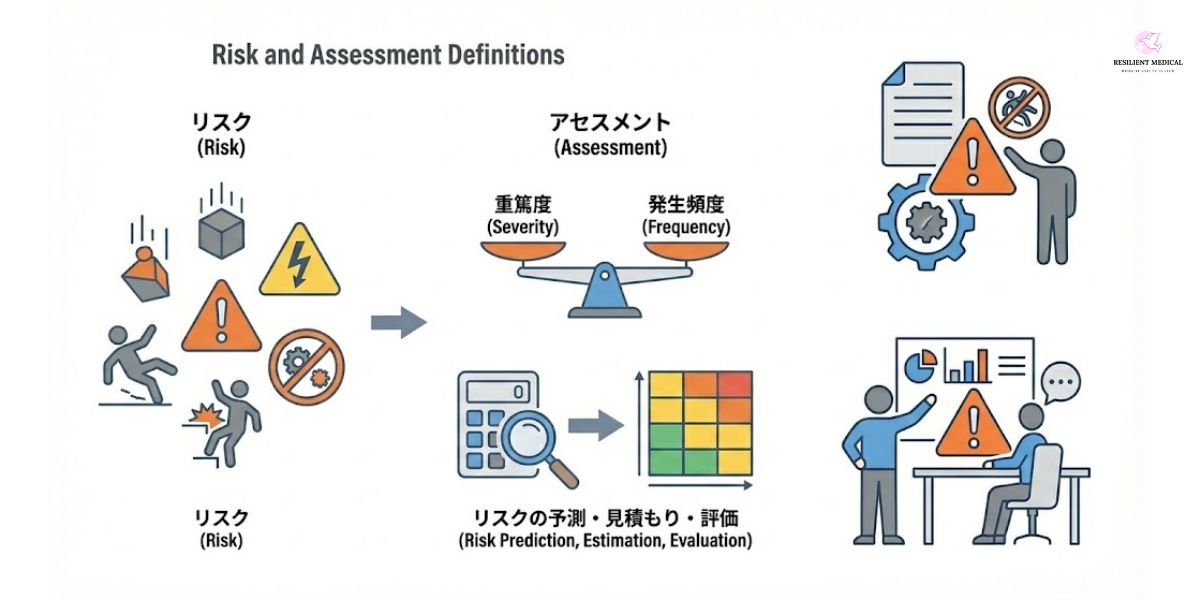 リスクアセスメントを理解するためには、まず「リスク」と「アセスメント」の定義を把握する必要がある。リスクは危機や危険と理解されるが、その範囲は広く、不安全な行為や状態も含まれる。アセスメントはリスクの重篤度と発生頻度を予測し評価する過程であり、これによってリスクの管理やコミュニケーションが可能となる。