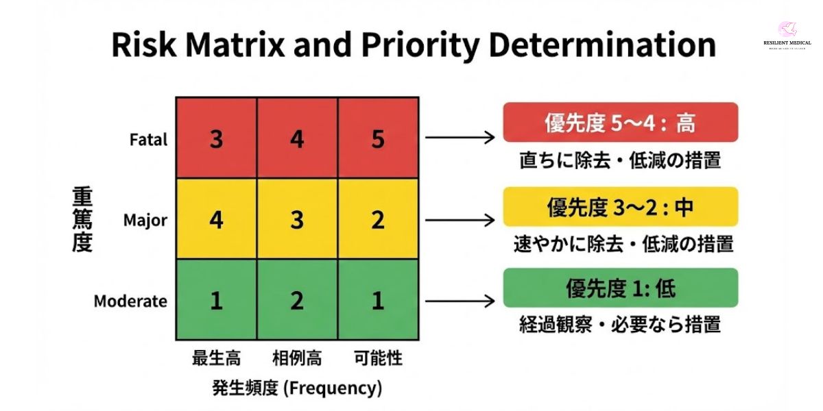 - 優先度の決定: 評価結果をもとに、除去または低減するリスクの優先度を決定する。高い優先度のリスクには直ちに対策が必要であり、低い優先度のものは経過をみつつ対策を検討する。