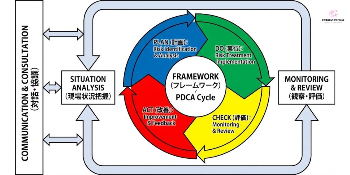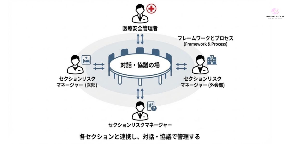 そのため、医療安全におけるリスクマネジメントは、医療安全管理者を中心として各セクションのリスクマネージャーと連携し、フレームワークとプロセスの間において対話し協議することで管理しましょう。