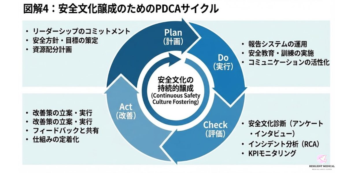 これらの知見を踏まえ、組織は安全文化の成熟度を定量的・定性的に評価し、PDCAサイクルを回しながらリーダーシップと現場の協働により持続的に改善していくべきである。安全文化は一朝一夕に築けるものではなく、不断のコミットメントと適応力こそが、将来にわたる組織のレジリエンスを支える要である