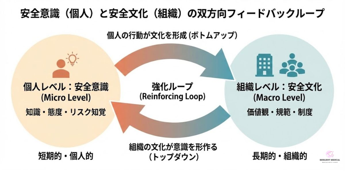 安全文化と安全意識は異なるレベルの概念でありながら、相互作用を通じて安全成果を形作る。両者を区別しつつ統合的に理解・介入することが、持続的な安全性向上の鍵となる。