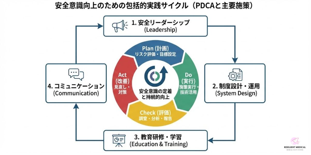これらをPDCAサイクルで継続的に運用することで、安全意識は組織文化に定着し、高い投資対効果を実現する。