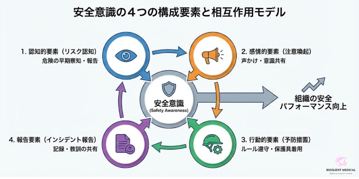 安全意識(Safety Awareness)とは、個人が日常業務に潜む潜在的な危険やリスクを認識し、それに対して主体的に対応しようとする態度および行動傾向を指す概念である。安全意識は、以下の四つの主要要素を統合的に機能させることで、組織の安全パフォーマンスを向上させる基盤となる。