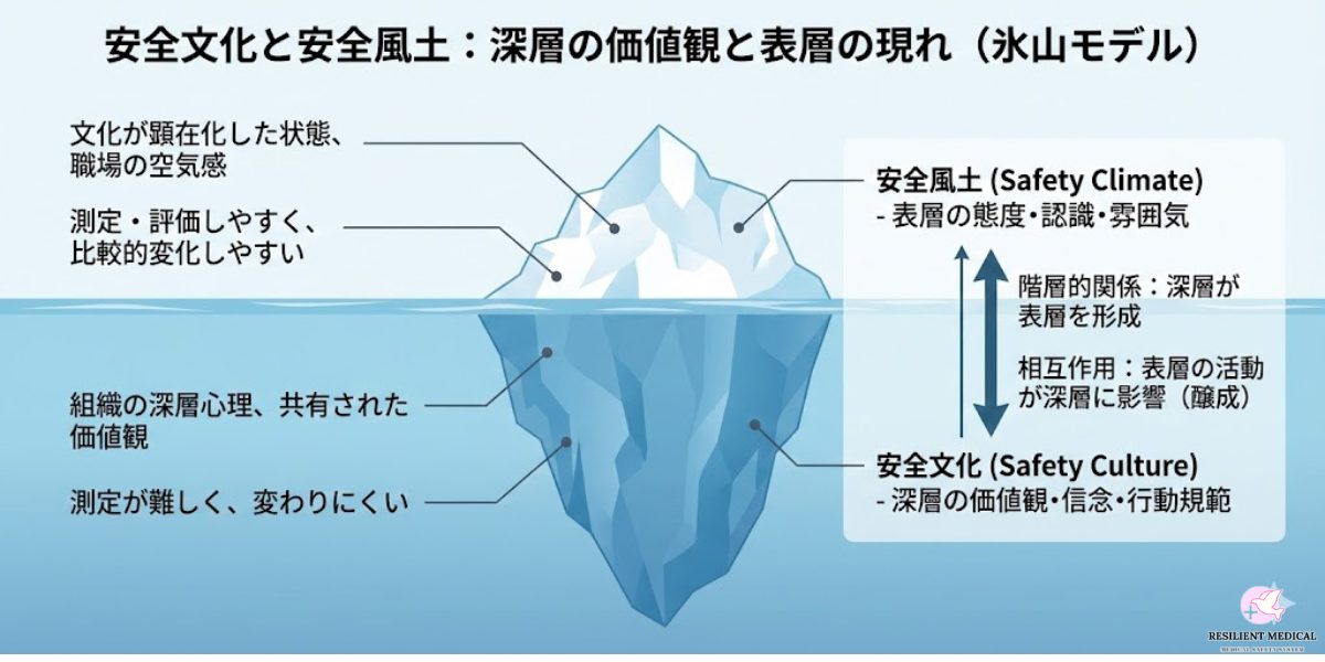 安全文化が深層の価値観・信念・行動規範を含むものであるのに対し、安全風土はその文化が顕在化した、あるいは表層的に現れた状態と捉えられる。