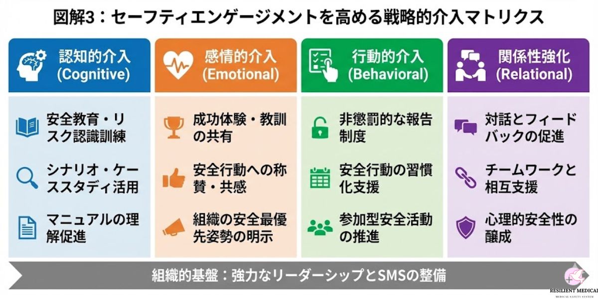 セーフティエンゲージメントは一度醸成されれば固定的に維持されるものではなく、組織環境や経営方針、人員構成の変化によって容易に変動する。したがって、継続的かつ多層的な戦略により意図的に強化していく必要がある。本節では、その具体的方策を心理的要因、リーダーシップ要因、制度的要因の三つの観点から論じる。