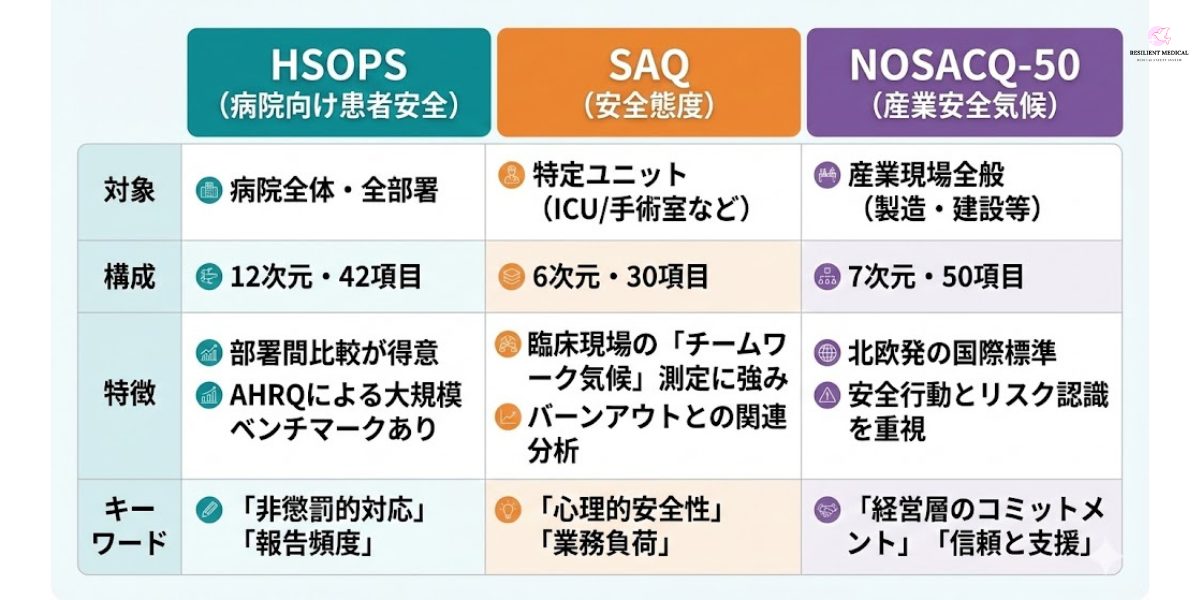 HSOPS(42項目・12次元)、SAQ(30項目・6次元)、NOSACQ-50(50項目・7次元)など、対象領域と評価次元が異なる主要質問紙の特徴を比較し、ベンチマーキングや多職種比較の有用性を整理した。信頼性・妥当性評価手法