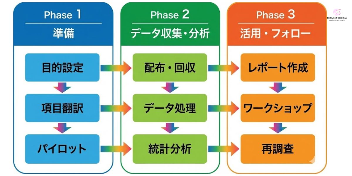 目的設定/ツール選定→翻訳・認知インタビュー→パイロット→配布・回収→データクリーニング→統計分析(α、因子分析、SEM 等)→結果フィードバック→部門別ワークショップ→フォローアップ再調査というPDCA サイクルを詳細に解説した。医療現場への適用事例